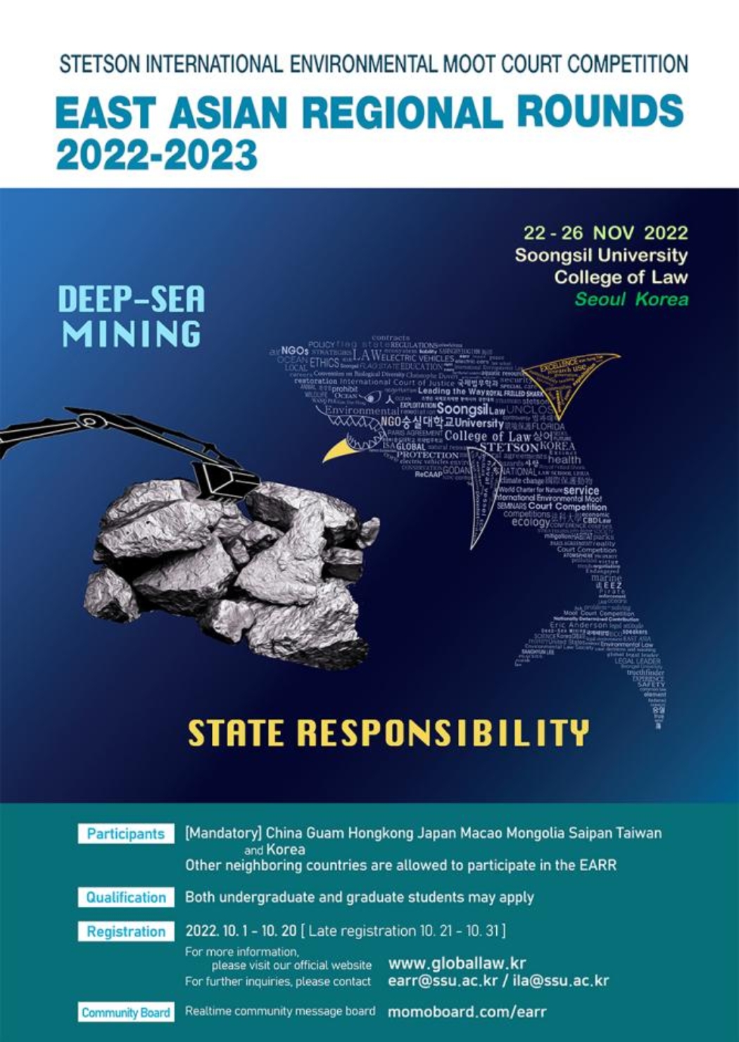 国际环境法模拟法庭大赛创始于1996年,由美国史丹森大学法学院(Stetson University College of Law)主办,是国际环境法领域极具广泛国际影响力的模拟法庭比赛。该比赛全程使用英文,分为地区选拔赛和国际决赛两个阶段。本届东亚赛区选拔赛由韩国崇实大学承办,赛题围绕主题“Deep-sea Mining and State Responsibility”展开,讨论深海采矿与生态海盗国际法规制等海洋环境保护重要议题。