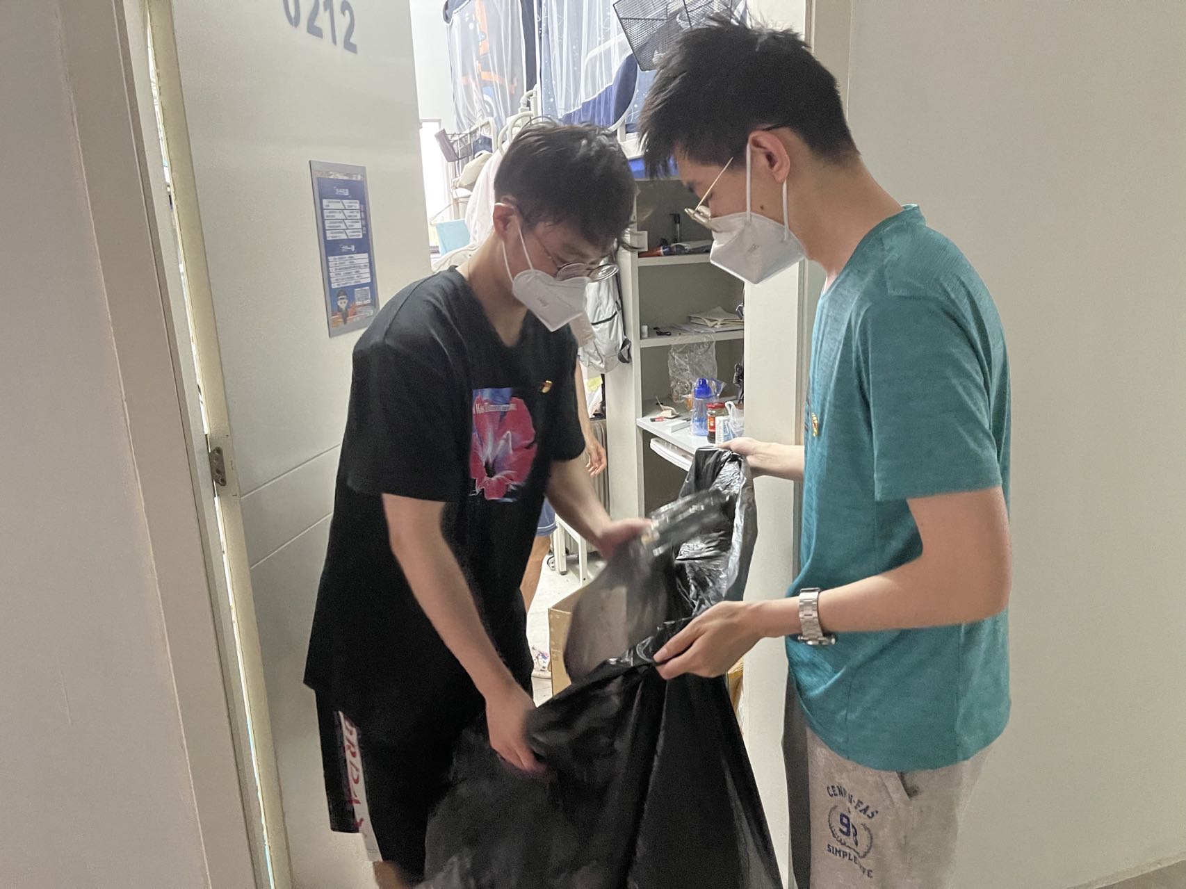 党员和志愿者们进入宿舍、食堂分发口罩