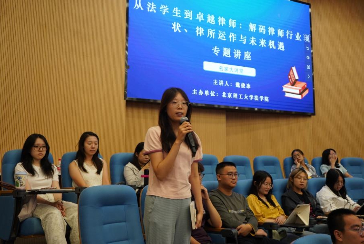 在互动交流环节,同学们围绕“律师职业规划”“律所实习准备”等问题积极提问。魏俊冰结合自身经历逐一解答,鼓励同学们既要打好专业基础,又要通过模拟法庭、法律志愿服务等实践活动积累经验。