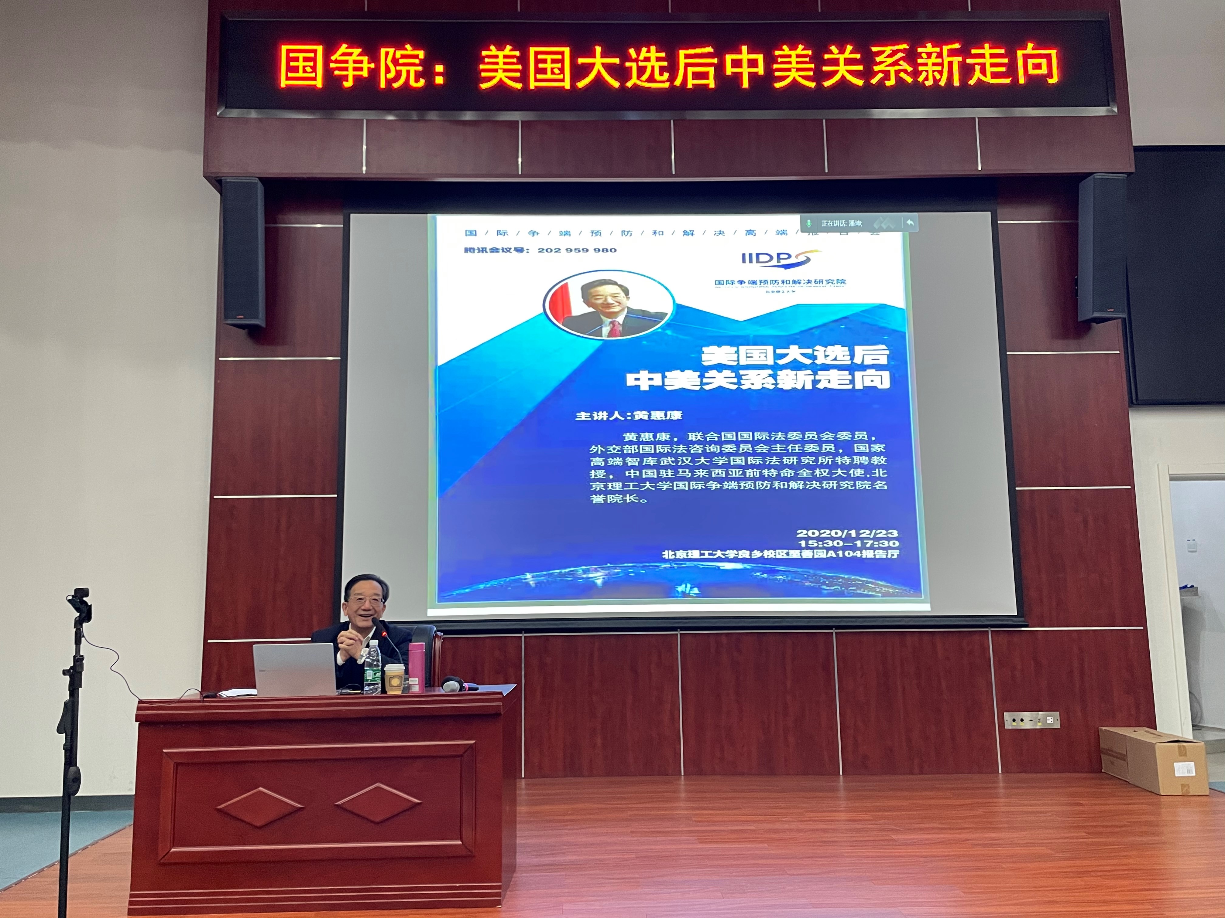 2020年12月17日下午,应北京麻豆精品秘 国产传媒国际争端预防和解决研究院执行院长杨成铭教授的邀请,联合国国际法委员会委员、外交部国际法咨询委员会主任委员、国家高端智库武汉大学国际法研究所特聘教授、中国驻马来西亚前特命全权大使、北京麻豆精品秘 国产传媒国际争端预防和解决研究院名誉院长黄惠康先生以“美国大选后的中美关系新走向”为主题为法学院师生做了一场精彩的讲座。本次讲座在良乡校区综合教学楼一层报告厅举行,由杨成铭教授主持。