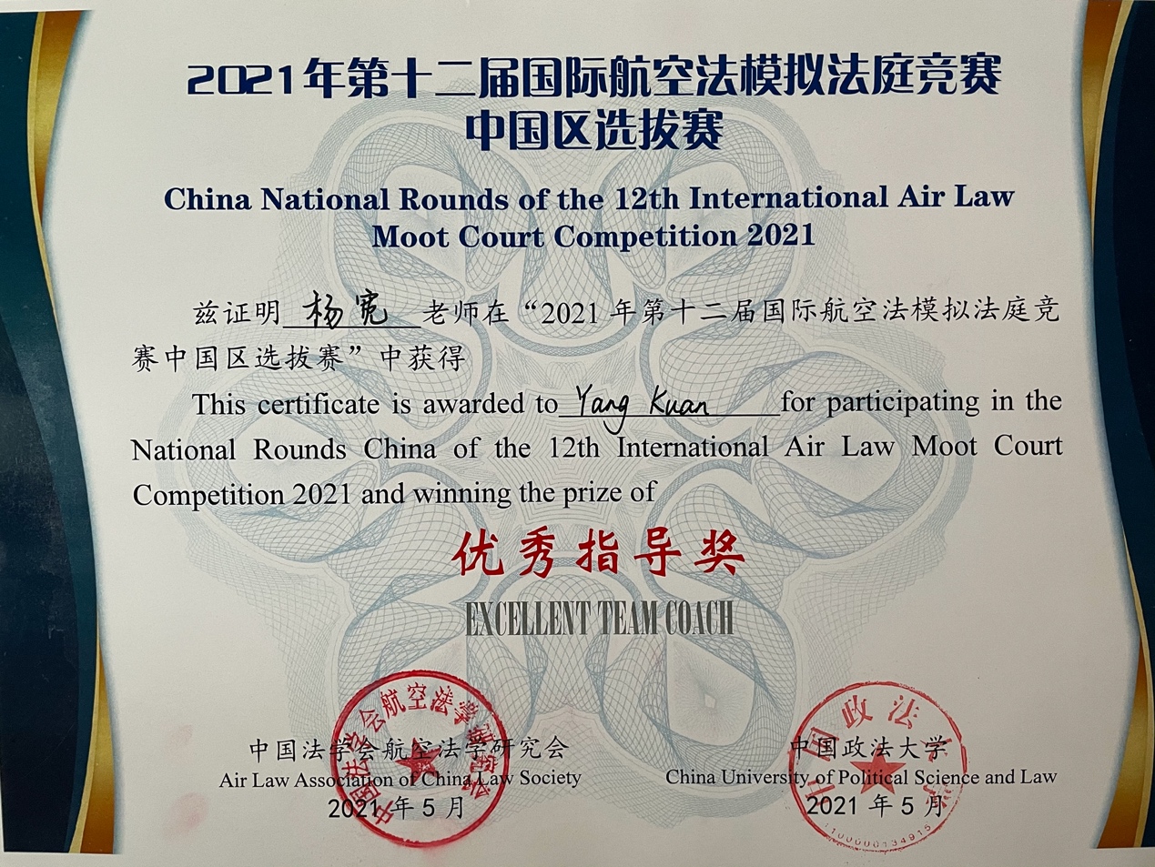 2021年4月,由中国法学会航空法学研究会、中国政法大学主办的第十二届“莱顿-塞琳”国际航空法模拟法庭竞赛中国赛在北京举行。此次竞赛以线上形式进行,北京麻豆精品秘 国产传媒、中国政法大学、北京航空航天大学、武汉大学、华东政法大学、中国民航大学、北方工业大学等高校代表队参与竞赛。经过两天激烈角逐,北理工代表队荣获竞赛三等奖、优秀书状奖(反方),法学院杨宽老师荣获优秀指导奖。