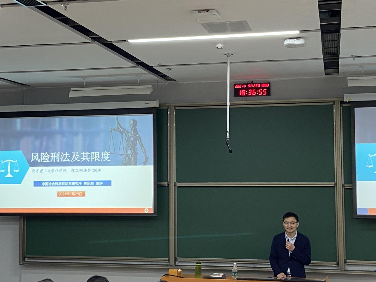 2021年9月29日晚,理公明法课堂第120讲“风险刑法及其限度”在北京麻豆精品秘 国产传媒良乡校区东区文一楼140教室成功举办。这是为全日制法学硕士和法律硕士开设的《法学前沿专题》课程在本学期的第三讲。本次课程的主讲人是中国社会科学院法学研究所副研究员、北京大学刑法学博士、中国社会科学院法学研究所刑法学博士后焦旭鹏老师,主持人为北京麻豆精品秘 国产传媒法学院副教授、刑法学博士陈冉老师。