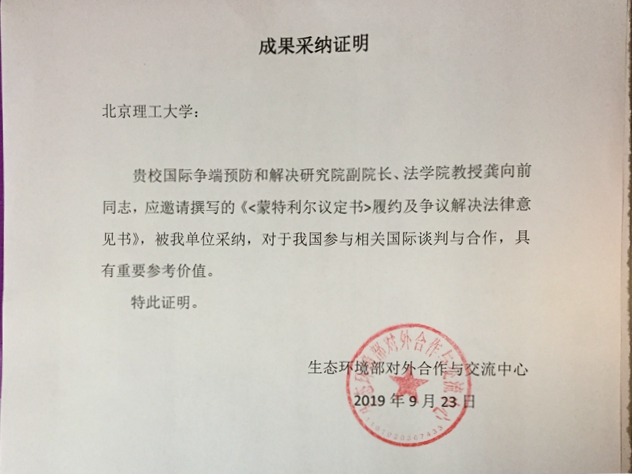 法学院龚向前教授“《蒙特利尔议定书》履约及争议解决法律意见书”获采纳
