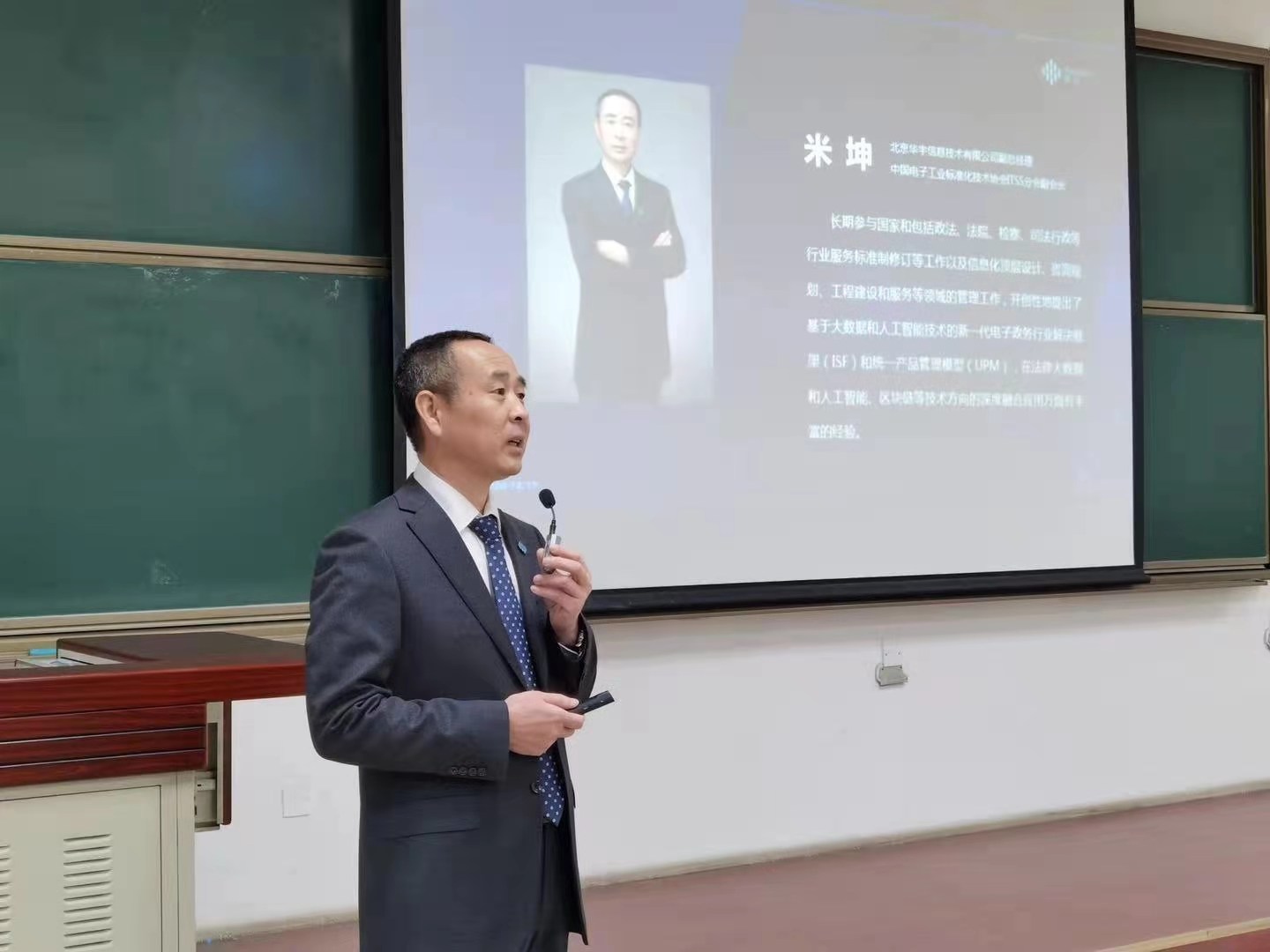 2020年12月17日晚,应我院诉讼法所长彭海青教授的邀请,北京华宇信息技术有限公司副总经理、国家信息技术标准委员会ITSS分技术委员会委员、中国电子工业标准化技术委员会ITSS副会长、可信区块链联盟理事米坤先生做客法学院,以“人工智能在司法审判中的应用”为主题为同学们做了一场精彩的讲座。本次讲座是我院举办的理工明法论坛第117讲暨诉讼法知行讲坛第15讲,在良乡校区理教楼101教室举行,由彭海青教授主持。