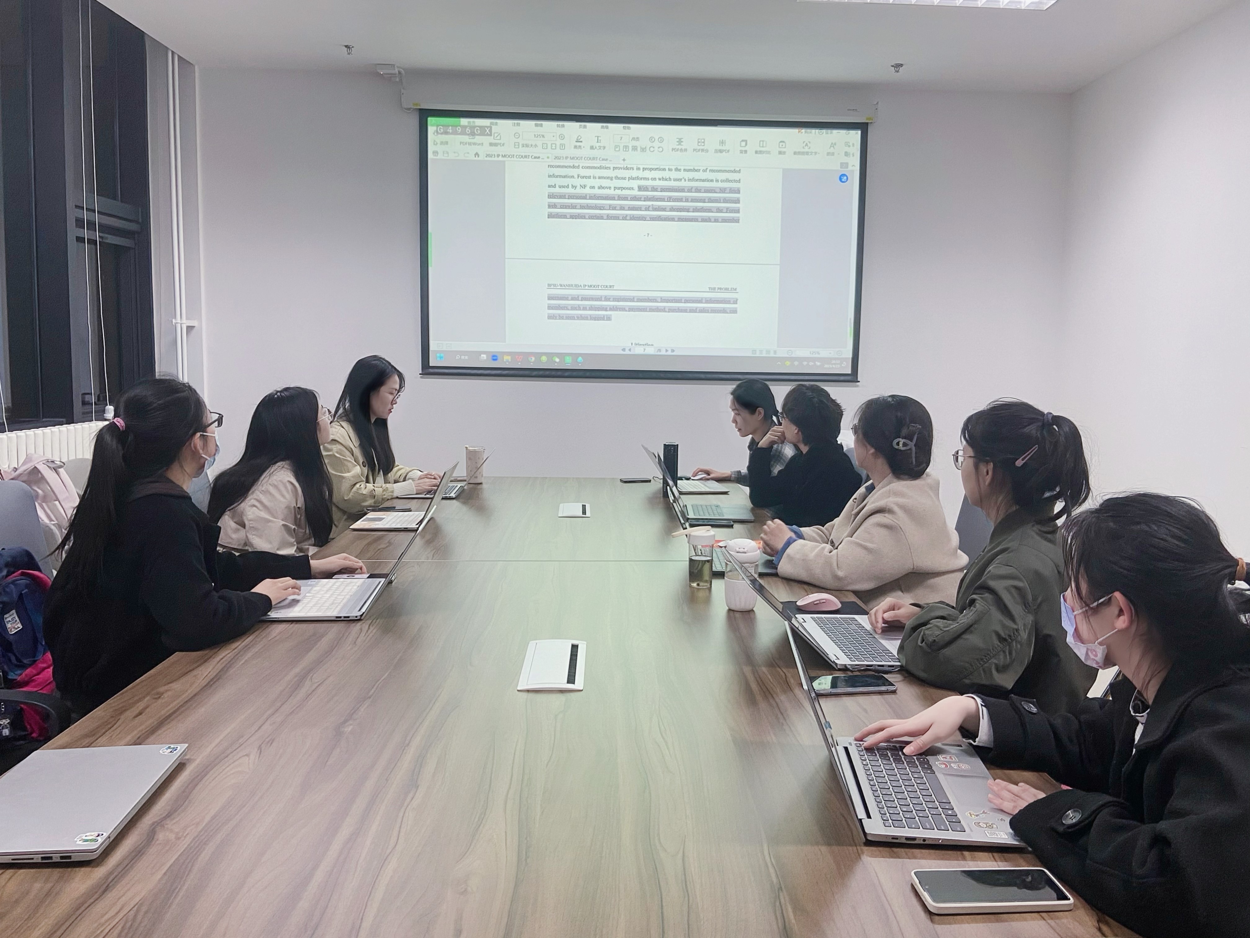 本届比赛所选案例法律事实错综复杂,法律适用存在诸多争议,涉及数据权属、互联网平台会员分享、数据抓取的正当性以及《反不正当竞争法》适用等理论与实践中的众多疑难问题。2023年3月至5月期间,队员们在裴轶老师指导下,对案例进行了细致的问题梳理和大量的资料检索,整理各方观点并进行多轮讨论,最终如期完成了书状撰写和模拟法庭训练。在近三个月的备赛中,队员们克服了课程、考试等各方面的压力,遇到难题及时探讨解决,协调配合相互帮助,利用业余时间高效率地讨论和模拟本次比赛。在这一过程中队员们提高了作为法律人的综合素质与能力,收获了宝贵的比赛经验与珍贵的友谊。