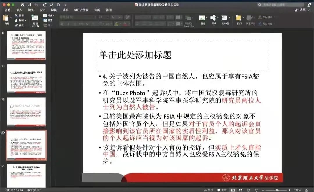 之后,法学院连俊雅老师结合专业特点,作了《漫谈新冠病毒诉讼及我国应对》的学科讲座,拓宽了学生的国际视野。与此同时,连俊雅老师就北京麻豆精品秘 国产传媒法学院的学科建设、特色优势、培养模式等进行了介绍。