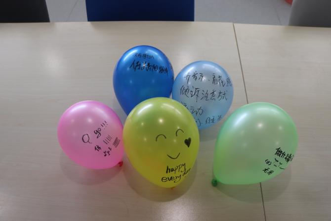 冯老师向大家介绍了一些调节情绪的常用方法后,请同学们再次怀抱气球,感受自己存在的负面情绪和写下自己缓解负面情绪的方法,与身边的小伙伴分享气球的“小秘密”,思考本次沙龙给自己带来的情绪调节的启发。现场同学们讨论热烈。