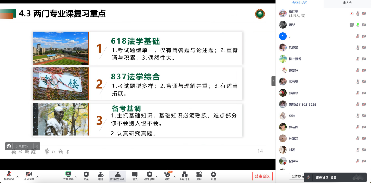 为深入学习贯彻党的二十大精神和习近平新时代中国特色社会主义思想,为同学们办实事,助力考研学生做好“研”途路上的学业规划,2023年6月30日,由法学院教学办公室组织的考研经验分享会在线上顺利举办。
