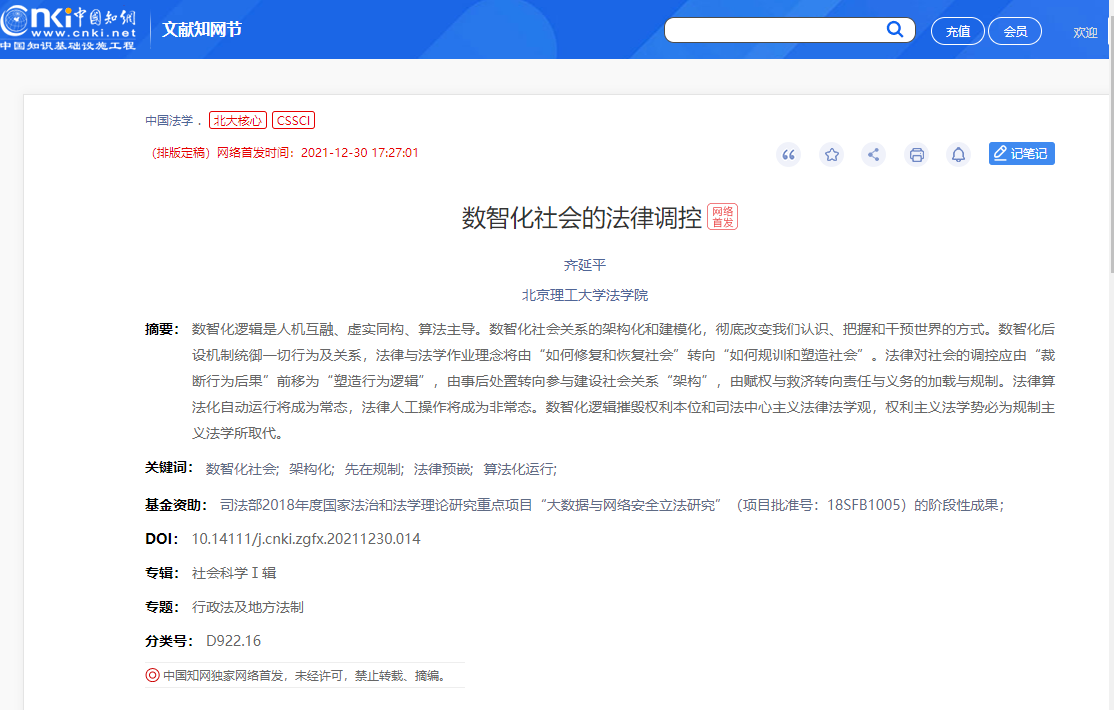 北理工法学院齐延平教授在国内法学顶级期刊《中国法学》发表论文2022-01-05 -