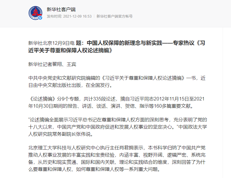【新华社】北理工法学院肖君拥教授就《习近平关于尊重和保障人权论述摘编》相关问题接受新华社记者采访2021-12-10 -